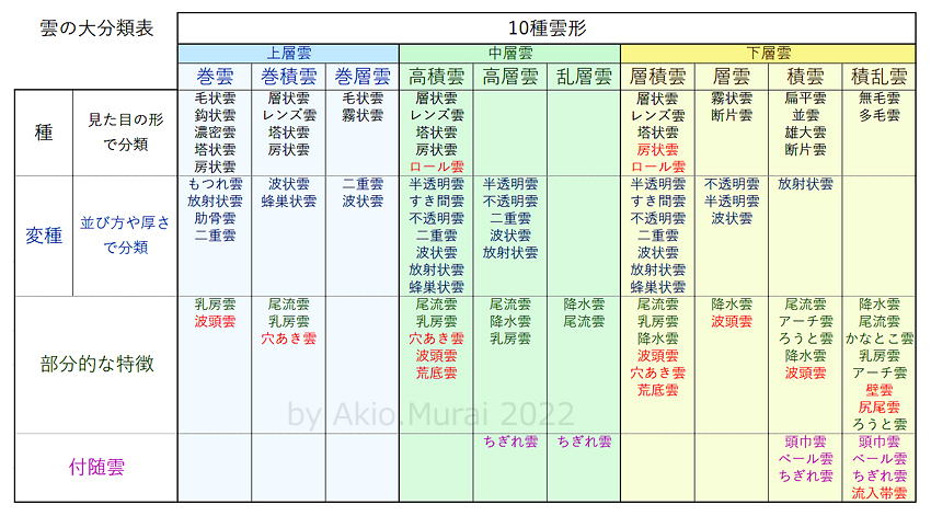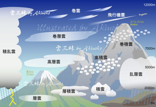 | ※積乱雲は雲底が低く「下層雲」に入れることもありますが、強烈な対流によって雲頂は対流圏界面に達するため「対流雲」として分けて扱う場合もあります。 |