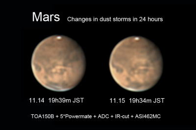 さらに遠ざかりつつある11月12日に突如発生したダストストーム。モニタの中で異様な火星を発見、毎日のその変容ぶりを体験できたのは刺激的だった。