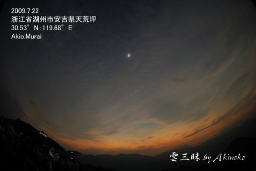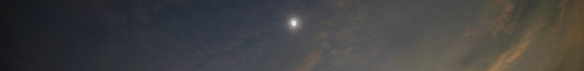 うっすらと巻層雲が覆う中の皆既。真っ昼間に星が見え、地平線が赤く染まっています。 対角線魚眼レンズで撮影。 |