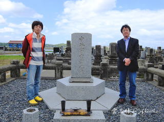 2016年4月に来沢した北見工大の亀田先生と。墓石の基礎部分が六角形になっている。 |