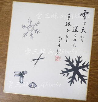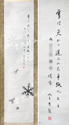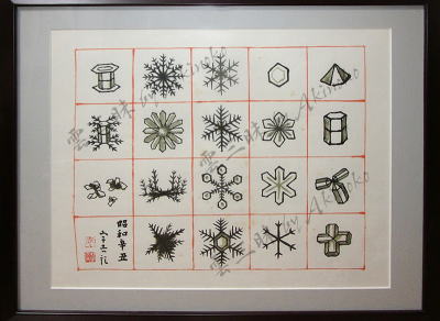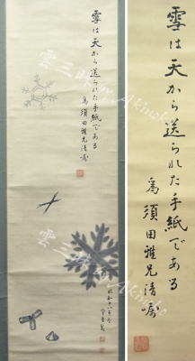 雪華の掛け軸は30数幅ほど描かれたと言う記録があります。私は、そのうち自身の所有するものを含めて7つを見たことがあります。雪結晶のレイアウトはどれもほぼ同じですが、書かれている賛は「雪は天から送られた手紙である」を代表に、「一片の雪の中にも千古の秘密、、、」等数種類あり、また湯川秀樹など中谷自身の物ではない物もあるようです。 |