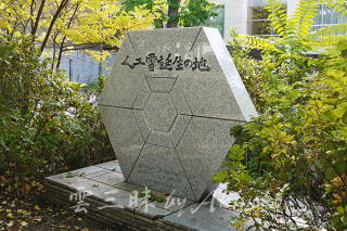 1936年、初めて人工雪結晶の生成に成功した常時低温研究室跡に、1979年7月に建てられた記念碑。 |