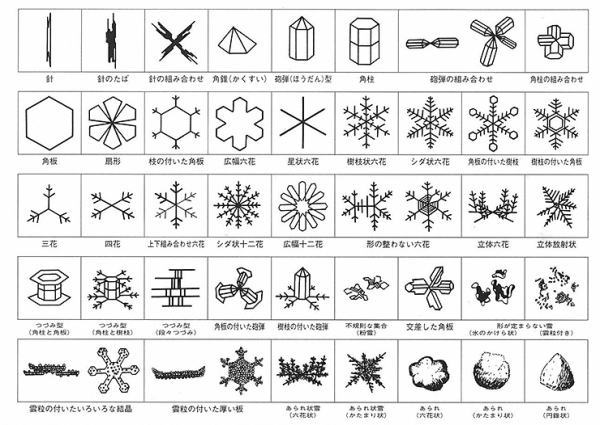 雪結晶分類では、中谷宇吉郎の一般分類(下図)が有名ですが、その後も1966年の孫野&Leeの気象学的分類など、世界ではこれまでにいろいろな雪結晶の分類がされてきました。 |