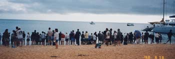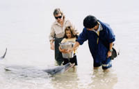 イルカの餌付け。 ここでは野生のイルカの餌付けをしている。朝、どこからともなく数匹のイルカが海岸へやってくる。それを見に、観光客が海岸へ集まってくる。 |