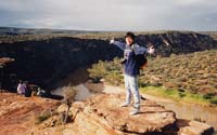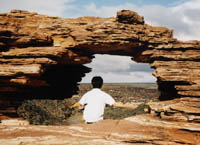 | ネイチャーズウインドウ 以前、ある写真集で見たことがあったので、知ってはいたが、自分が到着するまで自分がここに向かっているとは知らなくて、自然公園みたいなところを歩いていきなり現れた目の前の光景にビックリ。「窓」の向こうには果てしない地平線が広がる。移動中、野生のカンガルーが道に飛び出てきたり、エミュ(下の写真)がいたりと、人はいないが動物はみることがあった。 |