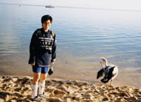 | 朝早く海岸を歩くと、野生のペリカンがいる。人を見ても全然逃げる様子がない。しかし、、、でかい口。 | ![]() |