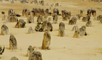 ピナクルズ 車の窓から遠くに砂丘が見え、そこに到着すると不思議な光景が広がる。砂の中から一面ににょきにょきと岩が飛び出ている。小さい物は膝くらい、大きな物は4mくらい。何で、こんな物ができたのか?ここは、ちゃんと展望台もあり整備されている。が、オーストラリアの観光スポットはどこへ行っても日本と違いあまり人はいないし、よけいな手が入っていない。もちろん、変なおみやげ屋も一切ない。 |