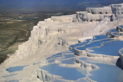 | パムッカレ 世界遺産。石灰質を含んだ水によって、段段畑状のプールができたもの。近くには、水着を着た人たちが水浴びをしていました。 ただ、世界遺産に指定されて、立ち入り禁止になったところが多く、左の写真のようなものは見えなかった(写真は絵葉書です)。ひどいところは、コンクリートで似たようなものを作ってあって、そこだけは自由に水浴びもできようになっています。 |