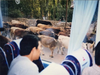 バスでの移動3日目の夕、いよいよ観測地ザラが近づいて来た。もちろん、何もない田舎。 突然バスのスピードが落ちる。と、バスの窓の外にはたくさんの牛の群れが。「遠いところへきたんだなぁ」と実感。 |