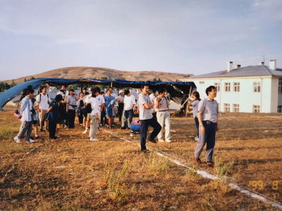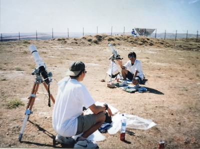 | 皆既日食当日 皆既は午後1時過ぎなのに朝6時に目がさめました。心配をよそに、天気は快晴。昨日下見を終えた観測地に移動し、観測の準備を整えて日食を待まちます。観測地は、ザラの神学校の敷地内の広場。 準備をしているときも、コーランの音が聞こえる。「天文ガイド」の本部からは、誰が持ってきたのか、なつかしの庄野真代「飛んでイスタンブール」の放送が流れてくる。 |