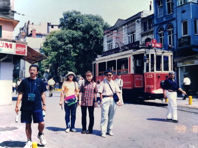 | 再びイスタンブール また2日間かけてイスタンブールへ戻って、フリーの日。計画どおりイスタンブール市内探検へ。目標は「電車に乗って」、「地下鉄に乗って」「バザール(市場)で買い物」をすること。 まず、市電(写真後ろ)の切符を買うのだが、トルコらしく、買うところによって値段が違う。為替レートからいって、あまりたいした額の違いではないのだが、なんか損したような気分になる。 |
