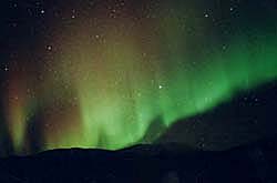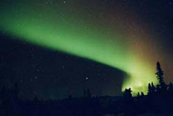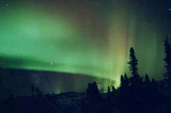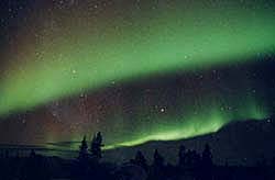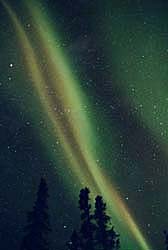 | 3日目(27日) いよいよ最後の夜。この日も快晴。アラスカの天に感謝。ただ、活動は活発ではなく北の空低いものでした。が、大変明るい(というか濃い)オーロラを見ることができました。 この日は冷え込み、愛機OM2のシャッター音がおかしくなり、ちょっとあせりました。−30度Cを越えるとさすがに苦しいようです。予備とあわせカメラは2台、レンズも2本用意して行ったのですが、正解でした。無事3日間でフィルム9本、約300コマ撮影できました。 |
