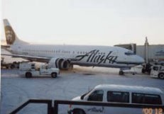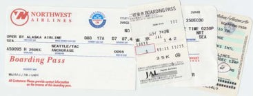長いアラスカ/チェナヘの道。 家→小松→羽田→成田→シアトル→アンカレッジ→フェアバンクス→チェナと27時間!飛行機だけで4回乗ってやっと到着(下は行きだけの4枚のチケット)。さすがに到着したときは疲れてました。しかし、その日から待ったなしのオーロラ観測が始まるのです。(写真はアラスカ航空機) |
