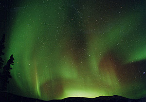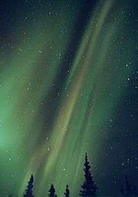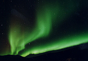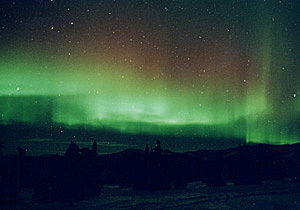 実際に見た感じは、下の山から噴煙が立ち上っているように見えました。大変濃いオーロラ。 |
