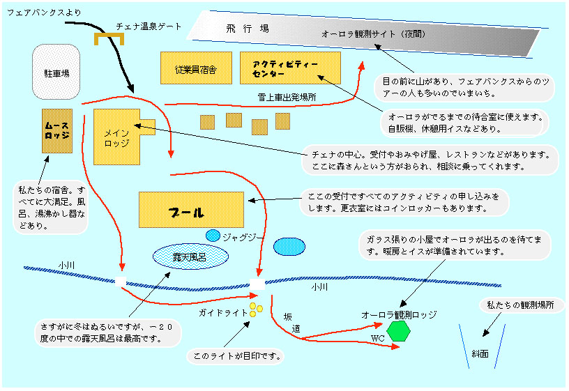 ムースロッジからオーロラ観測小屋まで約7分ですが、坂なのでちょっと息切れします(防寒着が重いので)。ロッジ周辺は照明されているので、少し離れた方がオーロラは見やすいと思います。特に、露天風呂の周辺はライトに照らされた湯煙がただよい、風情をかもし出していて良いのですが、これがオーロラには大変じゃまですので、少しでも高いところの方が良いようです。(特に撮影目的には)。