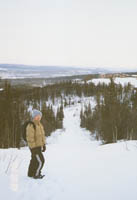 看板の地点から北方向を見るとこうなります。ちょうど目線の高さ(写真人物の後方の山の稜線の右端)に、ホテルドゥンドレットが見えます。