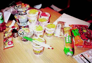 今回の持ち物 昨年(アラスカ)も大助かりだったミニカップヌードル、インスタントみそ汁は徹夜して冷え切った体を暖め、疲れをいやすのに必須です。 また、せんべいなどもスーツケースに忍ばせておきます。 |