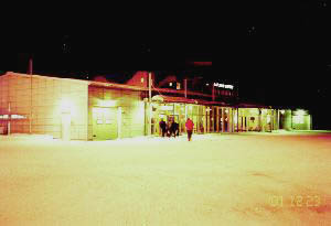 到着日のオーロラ 初日ははれていて、薄い(弱い)オーロラが北の空低く現れていました。このとき、我々の頭の中には「初日でこれなら充分!これからたっぷり楽しめるさ」と余裕があったのですが.... まさかこの後、雪が降り続けるとは思いもしなかったのでした。 |