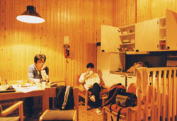 | 1階に寝室、2階に写真のダイニングキッチンがあり、食器や調理器具(電気コンロ、ナベ、ヤカン、ナイフ等)もそろっています。また、入り口には大きな乾燥庫があり、衣服や靴などを感想させることができて大変便利です。ただ、寝室の2段ベッドの上段が暖房で暑い! |