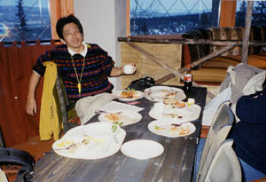 やはり楽しみは食事。 朝食はホテル内の「 」というレストランでとります。が、本当に人が少なく、おまけに座っているのは日本人だけ。セルフサービスのバイキング。シリアルにヨーグルトをかけて食べるのはおいしかったけど、さすがに3日目になるとあの独特のパンは飽きてきました。なんとここにはご飯も用意されています。 |