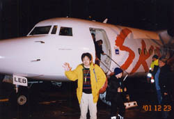移動は続く 最後の国内線は50人乗りの小さなプロペラ機。驚いたことに、自由席。おまけに我々の乗ったコペンハーゲンからの飛行機が遅れ、荷物の積み込みが終わっていたため、「yourself 自分で飛行機のところまで持っていけ」といわれ、スーツケースを引きずって滑走路を急いだのでした。 |