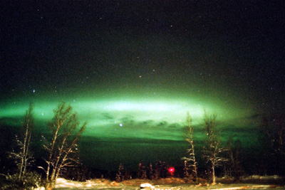 2日目 -27℃ 薄雲を通してぼんやり星が見える。10時過ぎに見つけておいたポイントへ向かう。 待機すること1時間。北の空低くオーロラが現れはじめる。しかし、ブレイクには至らず、2時過ぎに雲が濃くなったのを機に、撤退。あすもあるさ。 しかし、3日目は雪。星ひとつ見えず、雪が降り続ける。 |