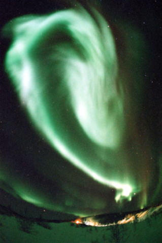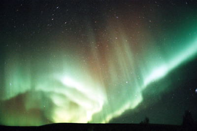 初日(27日)は快晴。-37℃。 午後8時に昼のうちにロケハンした場所へいき、待機開始。しかし、空は澄み、オーロラがでるとき特有の空の雰囲気ではない。 長く、冷たい静寂。全くオーロラの気配も感じられないまま、午前1時。北の空がオーロラ色に、、、と思った瞬間、それは始まった。 一気に緑の帯が広がり、空中を動き回る。空間がねじれたように渦巻く。 左 Fisheye Nikkor 16mm F2.8 下 Nikkor 24mm F2 10秒 |