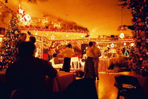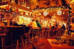 ロッジに入って、その中の電飾のすごさに驚く。クリスマスシーズンだからか、命をかけて飾ったと言う感じの豪華さ。 ここのバーは文字通り、地元の社交場と言った感じ。夜になると車で人々がどこからともなくあらわれ、陽気に飲む。なんと、ランニング姿の人も見える。 |