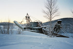 ロッジの正面の小山、スノーマシンのコースをたどると金の採掘場所の跡がある。廃墟のよう。昔はここに金を求めてたくさんの人がいたのだろう。 1日目の撮影は、人の来ないこの場所に決める。しかし、夜はとても不気味であった。 |