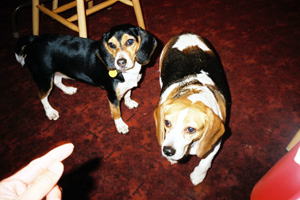 ![]() 左 ここの食事は安くて、多くて結構うまい。同行の辰巳さんも大満足。 上 食堂にはルーシー(左)とハンターの2匹のマスコット犬。ハンターはお客からえさをもらっているためか、まるまるとしている。 |
