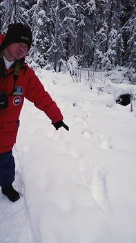 左 犬ぞりコース周辺にはムースの足跡がたくさん見られる。 上 足跡の大きさは、自分の足(26cm)と比べてみるとその大きさがわかる。角の差し渡しは2mにもなるという。 |