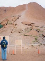 3週間ぶりの雨で、エアーズロックの登山口は危険防止のため閉鎖。目の前にして断念。「ここまできたのに」とあきらめきれない気持ちでいっぱいでした。写真にはゆるやかに見える斜面も、実際は大変な坂道。おまけにみがいたような表面なので、仕方がないのだとは思いますが。