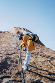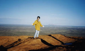 | 私たちにとって、記念すべき旅行でした。それなりに費用もかかりましたが、ホテルもすべて最上級だし(一度だけの贅沢)、エアーズロックもオルガもシドニーも最高としかいいようがない旅行でした。ただ、砂漠の中にしてはエアーズロックで雨が2日続いたのだけは残念でした。星の写真を撮ろうと思っていたのに...。でも晴れた日頂上にたって、その分感動しました。 あちらの人に聞いたところ、エアーズロックは「今の時期(冬)がいい」とのこと。夏(日本の冬)は50度C、ハエだらけで網がついた帽子をかぶって登るとのこと。また、エアーズロックは原先住民のアボリジニの聖地であり、いつか登山ができなくなる可能性があるそうです。でも、せっかくエアーズロックまで行くのだから、やはり登りたいですよね。 |