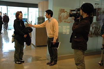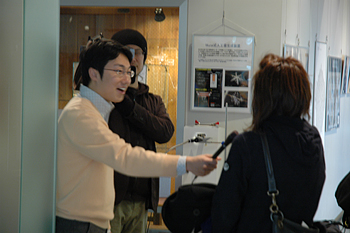 ![]() インタビューを受ける来館者。微妙な距離を置きながら、質問に答えていた。 |