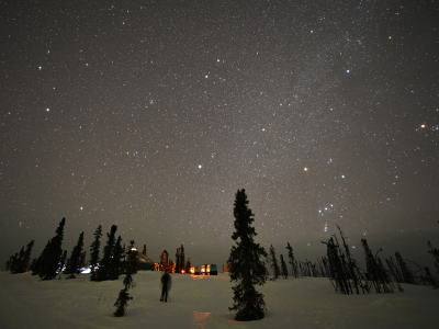空には冬の銀河とふたご座・オリオン座などが見える |