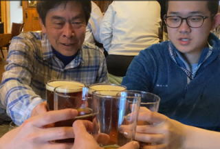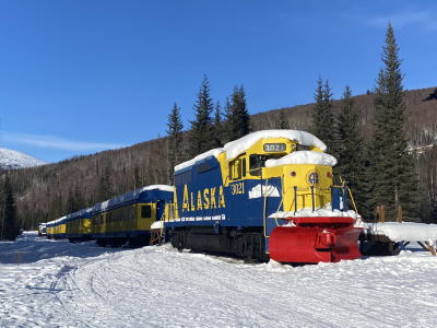 ケビンの近くにはアラスカ鉄道の機関車が置かれている |