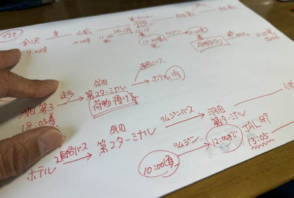 今回は金沢→小松→羽田→成田の往復移動が必要。航空機、リムジン、スーツケースの受け取り・発送、帰りはそれに加えて後泊の手配+ホテルからの移動が加わり、かなり複雑な予約と時間設定に。 |