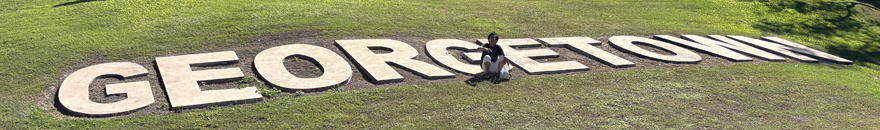 地上に置かれた「Georgetown」の表示の上で。