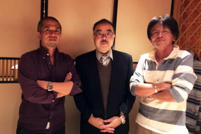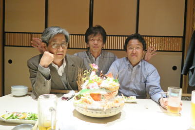 2018年12月 金沢「くすの樹」 天文界の大御所(?)のお二人、佃さん(左)・大杉さん(右)と。Facebookで交流があり、来沢された際にお会いした。 |