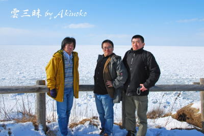 流氷をバックに北見工大の学生さんと |