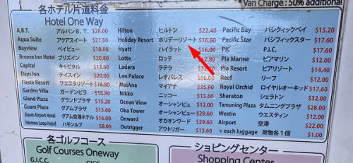 How much for Horiday Resort Hotel?とか適当な英語で聞くと、この表を指さす。